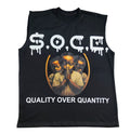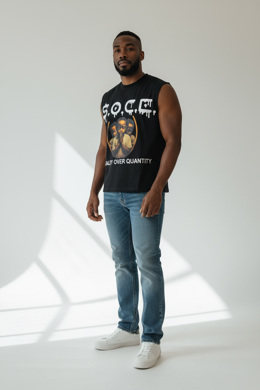A statement in style and in mindset. This sleeveless tee features a bold front graphic of prayer hands, symbolizing focus, faith, and discipline. Underneath, the Quality Over Quantity motto reminds the world that true value comes from precision, not excess.